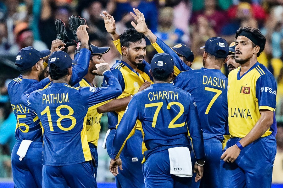 Sri Lanka's Dushmantha Chameera celebrates with teammates after taking the wicket of New Zealand's Tim Seifert during the 2026 ICC Men's T20 Cricket World Cup Super Eights match at the R Premadasa Stadium in Colombo on Wednesday-AFP