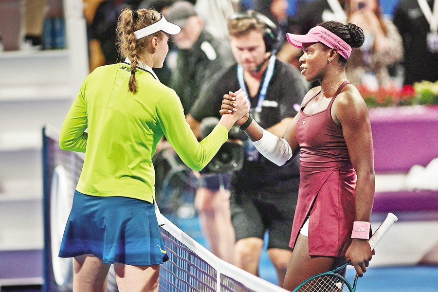 Canada's Victoria Mboko (R) is congratulated by Kazakhstan's Elena Rybakina after winning their women's singles quarter-final match at the Qatar Open tennis tournament in Doha on Thursday. — AFP