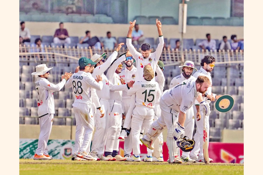 Bangladesh's Taijul Islam celebrates after getting a wicket of Ireland during the second and final Test on Day 4 at the Sher-e-Bangla National Cricket Stadium in the city on Saturday- BCB