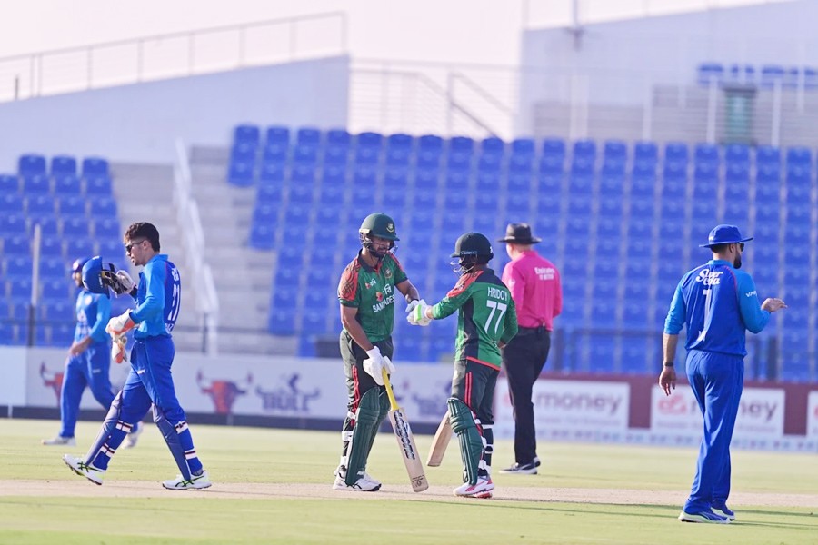 Mehidy Hasan Miraz and batter Towhid Hridoy rebuilt a partnership for Bangladesh at the Zayed Cricket Stadium in Abu Dhabi on Wednesday - ACB