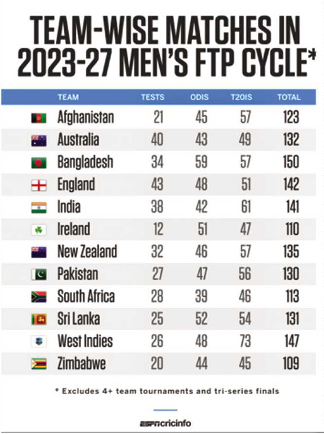 Bangladesh play the most bilateral international games (150) in the new FTP, followed by West Indies (147), England (142), India (141), New Zealand (135), Australia (132), Sri Lanka (131), Pakistan (130), Afghanistan (123), South Africa (113), Ireland (110) and Zimbabwe (109).