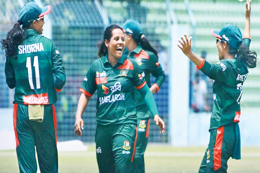 Bangladesh's Ritu Moni rejoices with teammates after taking a wicket against Sri Lanka during the 1st ODI match at the Rajshahi Divisional Stadium in Rajshahi city on Monday-bdnews24.com
