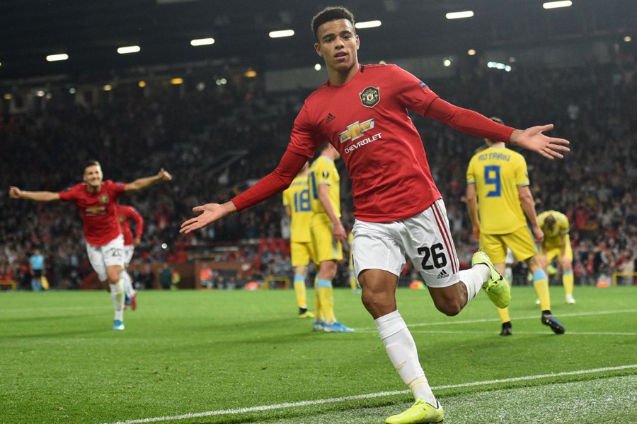 Manchester United's Mason Greenwood celebrating after scoring goal against Astana during the Europa League at Old Trafford, Manchester in Britain on Thursday — AFP