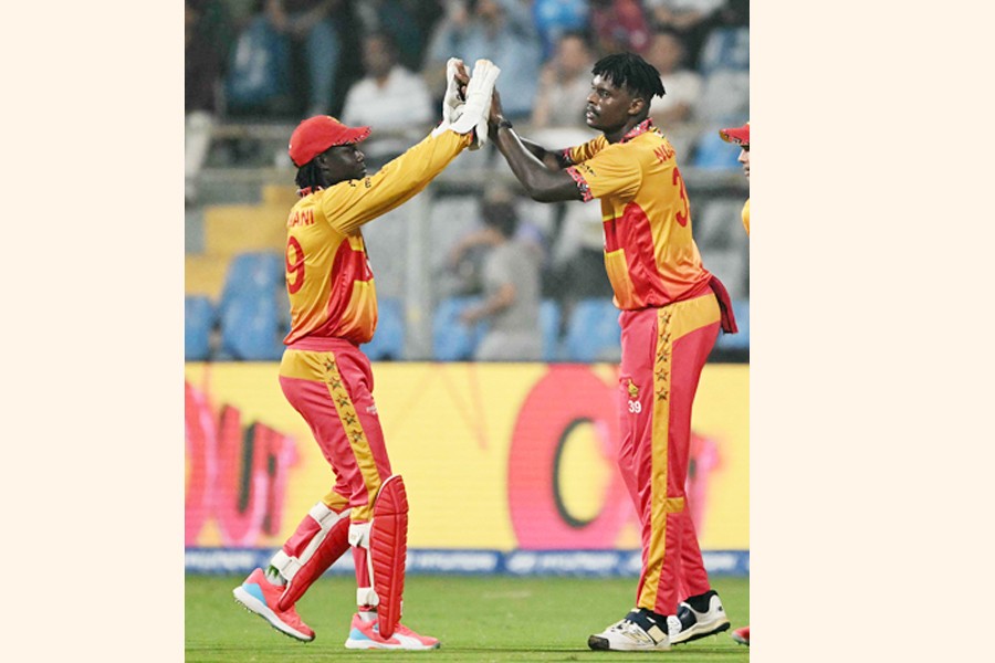 Zimbabwe's Richard Ngarava celebrates with teammates after taking the wicket of West Indies' Brandon King during the 2026 ICC Men's T20 Cricket World Cup Super Eights at the Wankhede Stadium in Mumbai on Monday — AFP