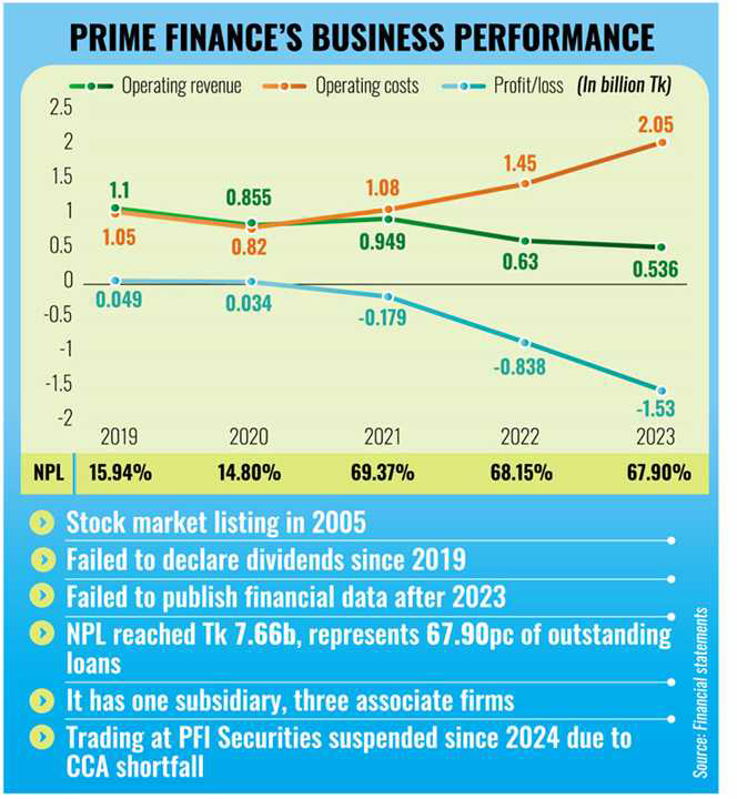 Due to higher non-performing loans, Prime Finance incurred a loss of Tk 1.53 billion in 2023, compared to a net loss of Tk 838 million the year before.
