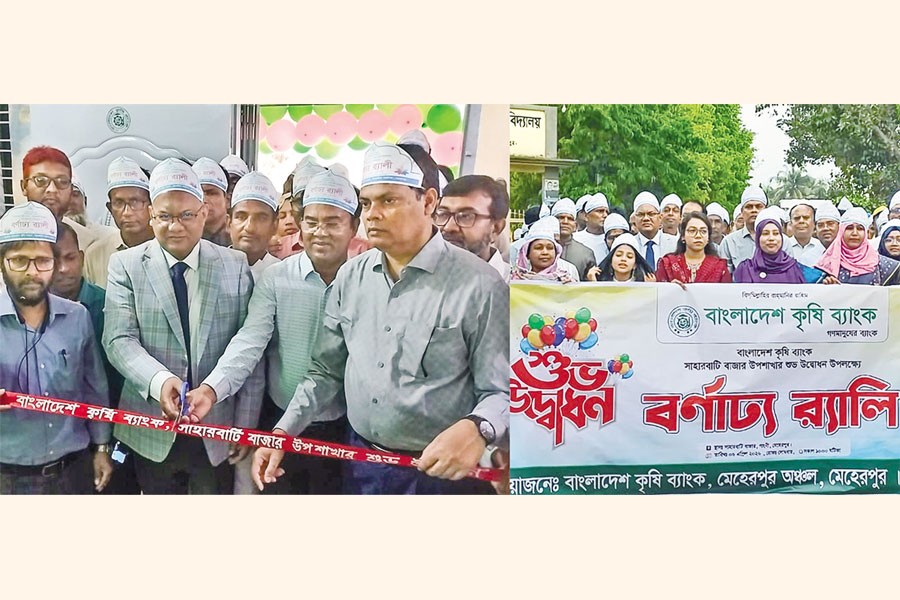 Bangladesh Krishi Bank opened Saharbati Bazar Sub-Branch under Gangni Branch in Meherpur on Monday with a view to strengthening rural economy. Deputy Managing Director of the bank Mohd. Khaleduzzaman formally inaugurated the sub-branch as the chief guest. Anwar Hossain, Upazila Nirbahi Officer (UNO) of Gangni, and General Manager of the Kushtia Division of Bangladesh Krishi Bank Utpal Kabiraj were present as special guests. The ceremony was presided over by Prahlad Kumar Hor, Regional Manager of Bangladesh Krishi Bank, Meherpur Region. On the very first day of inauguration, the sub-branch collected deposits amounting to Tk 7.0 million and disbursed agricultural loans worth Tk 2.2 million. Following the inauguration ceremony, a colourful rally was organised to mark the occasion.