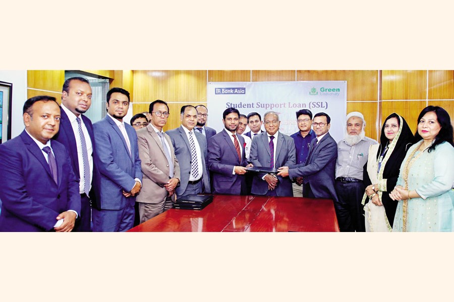 Bank Asia has signed an agreement with Green University of Bangladesh to provide Student Support Loan for the Honours and Masters level students recently. Mohammad Ziaul Hasan Molla, Deputy Managing Director of Bank Asia Ltd, and Md. Saiful Islam, Registrar (Acting), Green University of Bangladesh (GUB), inked the agreement from their respective sides with the presence of Prof. Dr. Md. Golam Samdani Fakir, Vice Chancellor of GUB.