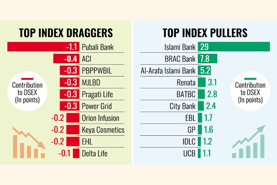 Among the top 10 index contributors, six were banks, including BRAC Bank, Al-Arafa Islami Bank, City Bank, Eastern Bank Ltd., and United Commercial Bank.