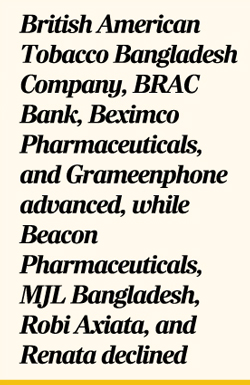 Among the blue chips, British American Tobacco Bangladesh Company, BRAC Bank, Beximco Pharmaceuticals, and Grameenphone advanced, while Beacon Pharmaceuticals, MJL Bangladesh, Robi Axiata, and Renata declined.