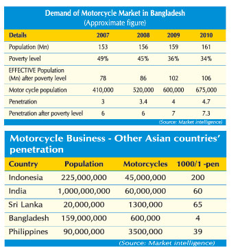 Against 1000 people having necessity to purchase and use motorbikes, only four of them are availing themes of the two-wheeler in Bangladesh, he said.