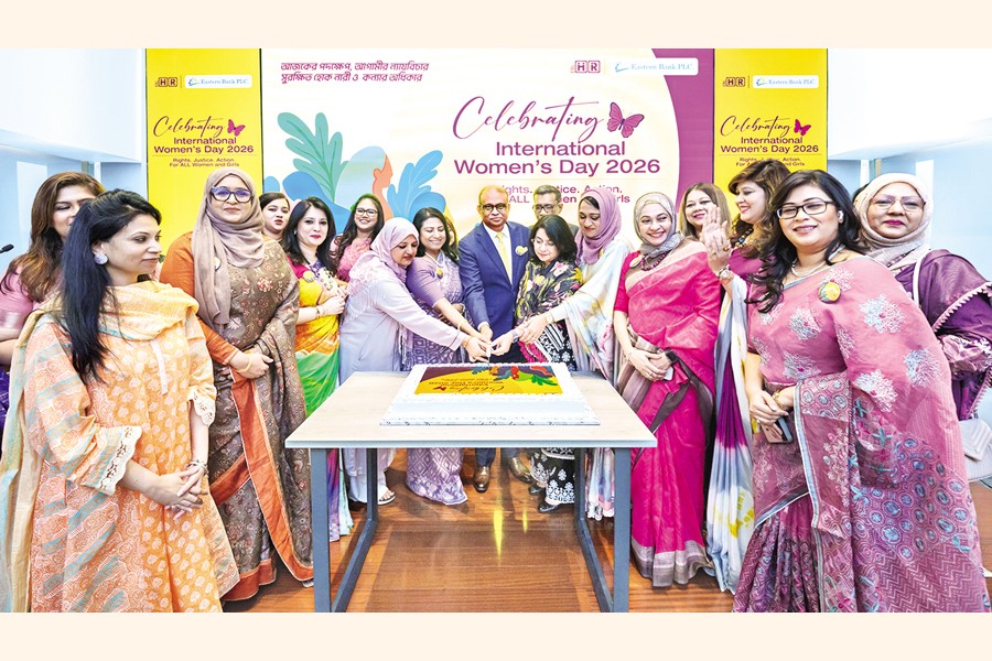 Eastern Bank PLC (EBL) celebrated International Women's Day 2026 at its Head Office in Dhaka on Sunday. At the event, four distinguished guests shared their inspiring journeys and perspectives. They are Yasmin Rahman, Chairman of Paragon Group; Captain Shumeila Hussain of Biman Bangladesh Airlines; Uzma Chowdhury, Director of PRAN-RFL Group; and Dr. Fahmida Khatun, Executive Director of the Centre for Policy Dialogue (CPD). The photo shows Ali Reza Iftekhar, Managing Director of EBL, along with the guests and the bank's women employees cutting a cake on the occasion.