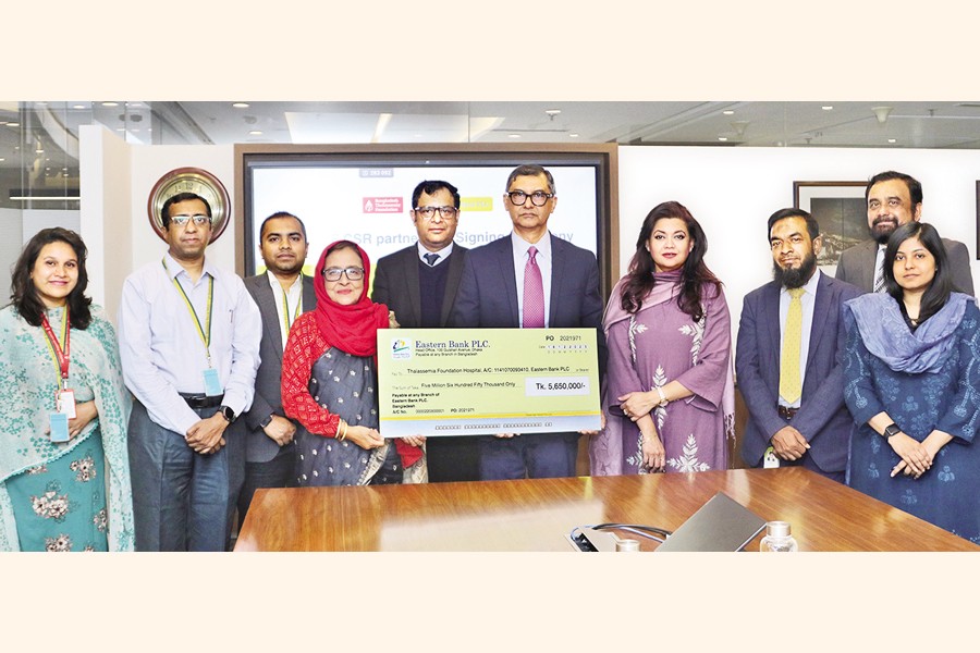 Eastern Bank (EBL) has partnered with Bangladesh Thalassemia Foundation to strengthen healthcare support for underprivileged patients suffering from thalassemia. To support the foundation's activities, Ziaul Karim, head of Communications and External Affairs at EBL, recently handed over a cheque to Professor Dr. Syeda Masooma Rahman, vice-chairman of the Foundation, at the bank's head office in Dhaka.