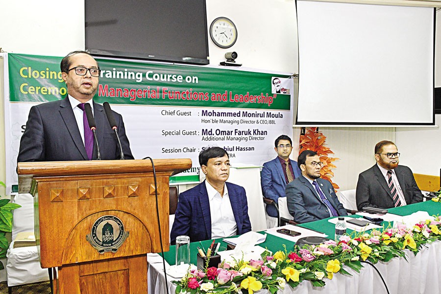 Islami Bank Training and Research Academy (IBTRA) organised a 5-day training programme on 'Managerial Functions and Leadership'. Mohammed Monirul Moula, Managing Director & CEO of the bank, addressed the concluding session of the training on Thursday as the chief guest. Md. Omar Faruk Khan, Additional Managing Director of the bank, addressed the programme as special guest.