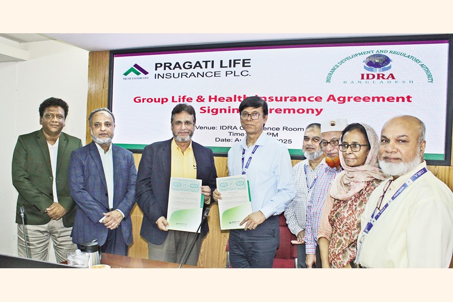 Insurance Development and Regulatory Authority (IDRA) has recently signed a group life & health insurance agreement with Pragati Life Insurance PLC. Dr. M Aslam Alam, Chairman of IDRA, and Md. Jalalul Azim, Managing Director & CEO of Pragati Life, signed the agreement. Under this agreement, Pragati Life will provide Group Life and Health Insurance coverage to the employees of IDRA. Md. Fazlul Haque, Member (Administration); Tanzina Ismail, Member (Law); Mohammad Abu Bakar Siddique, Member (Non-Life) and Md. Apel Mahmud, ACII (UK), Member (Life) of IDRA, and Md. Rafiqual Alam Bhuiyan, Addl. Managing Director of Pragati Life, were present.