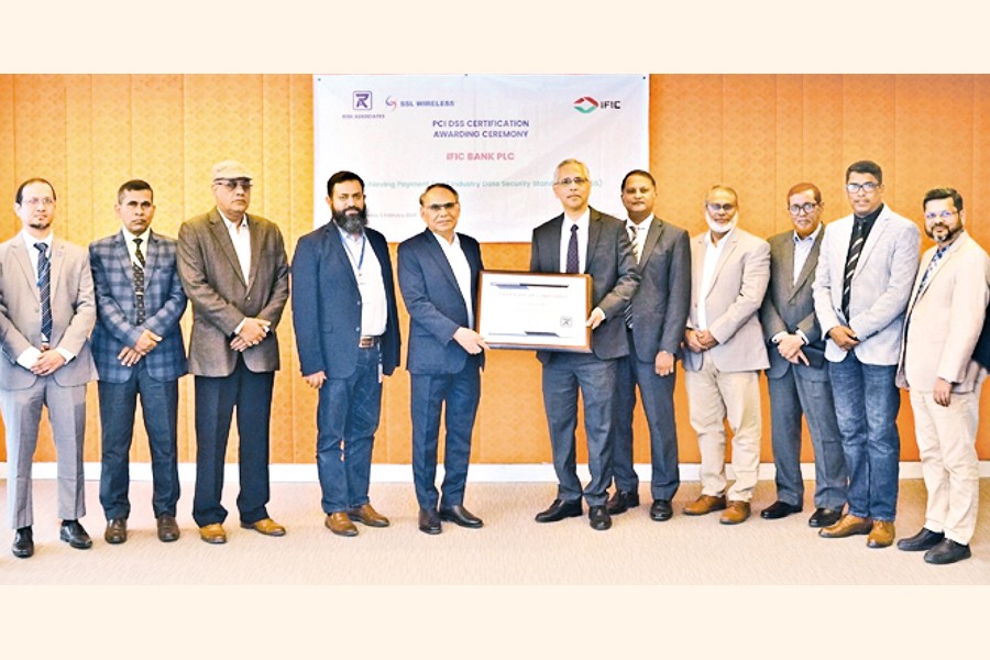 As a reflection of IFIC Bank's continued commitment and capability in card data security management, the bank has achieved the internationally recognised Payment Card Industry Data Security Standard (PCI DSS) certification for the fourth consecutive year. The certification handover ceremony was held on Thursday at IFIC Tower, Dhaka. Syed Mansur Mustafa, the bank's managing director, formally received the certificate from Dr. Aftab Rizvi, CEO of Risk Associates, the certification authority, and Iftekhar Alam Ishaque, CEO of SSL Wireless Limited.
