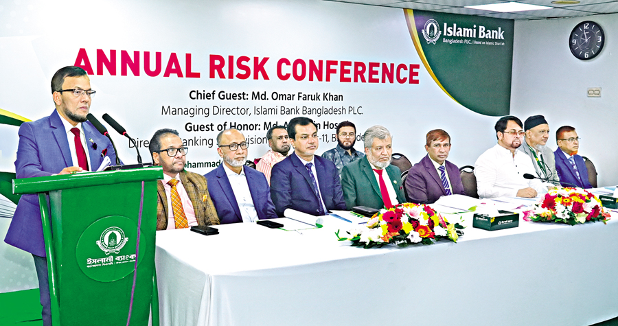 Islami Bank Bangladesh PLC held its Annual Risk Conference at the Islami Bank Tower on Saturday. Md. Omar Faruk Khan, Managing Director of the bank, was present as the chief guest while Md. Alauddin Hossain, Director of Bangladesh Bank, spoke as the guest of honour. Mohammad Jamal Uddin Mazumder, Additional Managing Director and Chief Risk Officer of the bank, presided over the event. A.S.M. Rezaul Karim, Director General of Islami Bank Training and Research Academy (IBTRA), delivered the welcome address.