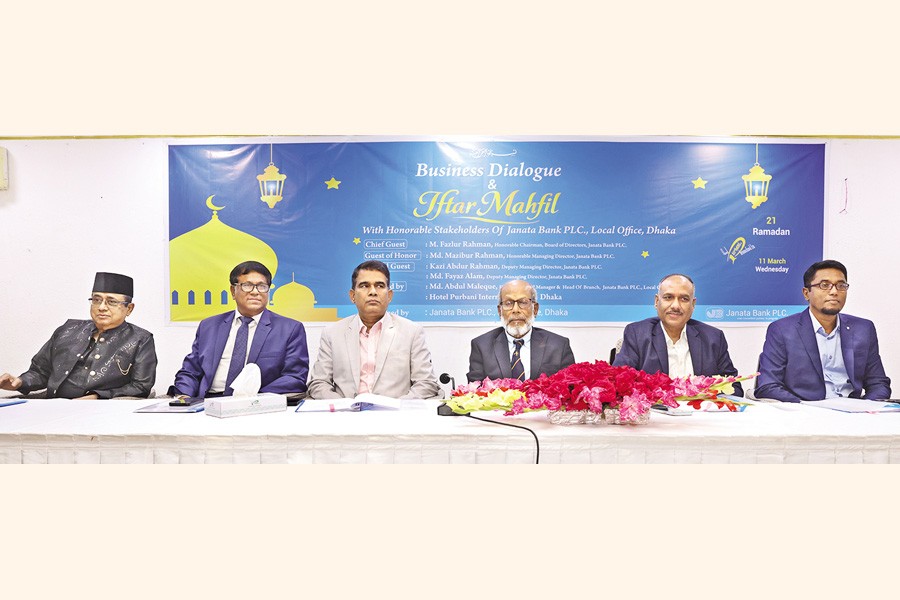 Janata Bank PLC held a business dialogue and Iftar mahfil in participation with clients of the local office of the bank at a hotel in the capital on Wednesday. Chairman of the bank Md Fazlur Rahman attended the programme as the chief guest. Managing Director Md Mazibur Rahman was present as the guest of honour and Deputy Managing Director Kazi Abdur Rahman as a special guest. The discussion was presided over by the head of the bank's local office, Md. Abdul Malek. Prominent business clients of the branch were present at the event.