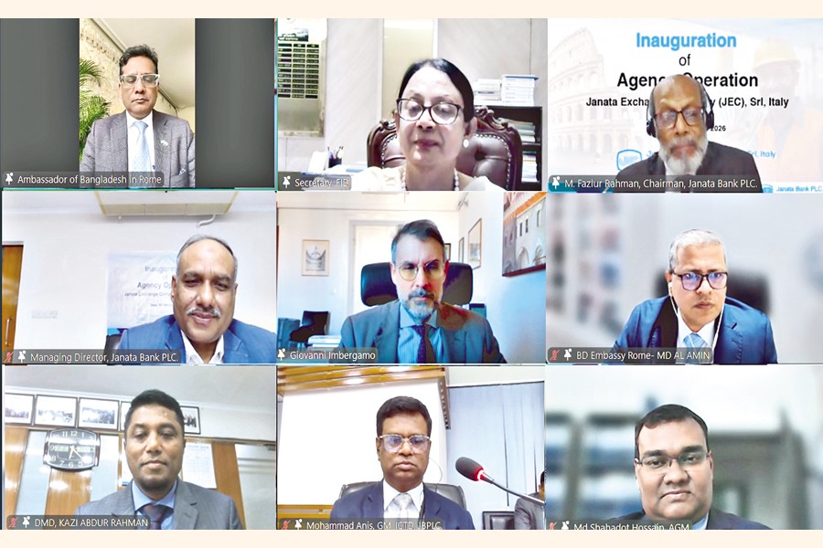 Janata Exchange Company (JEC) SRL, Italy, a subsidiary of Janata Bank PLC, has established agent points in Italy to facilitate remittance transfers. The agent point operation was inaugurated on an online platform on Monday. Ambassador of Bangladesh to Italy A.T.M. Rokebul Haque was present as the guest of honour and Secretary of the Financial Institutions Division Nazma Moberak as the chief guest. Janata Bank's Chairman Md Fazlur Rahman, Economic Counsellor of the Bangladesh Embassy in Italy and Director of JEC Md Al Amin and JEC Director Giovanni Imbergamo were present as special guests. Janata Bank's MD and Chairman of JEC Md Mazibur Rahman presided over the event.