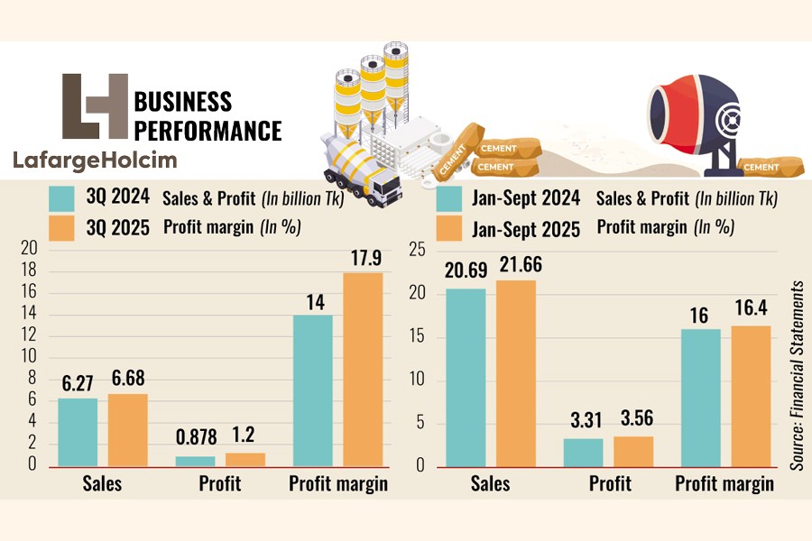 LafargeHolcim posted a 36 per cent year-on-year profit growth to Tk 1.20 billion in July-September - a remarkable feat at a time when the construction industry is reeling from sharp cuts in both public and private investment.