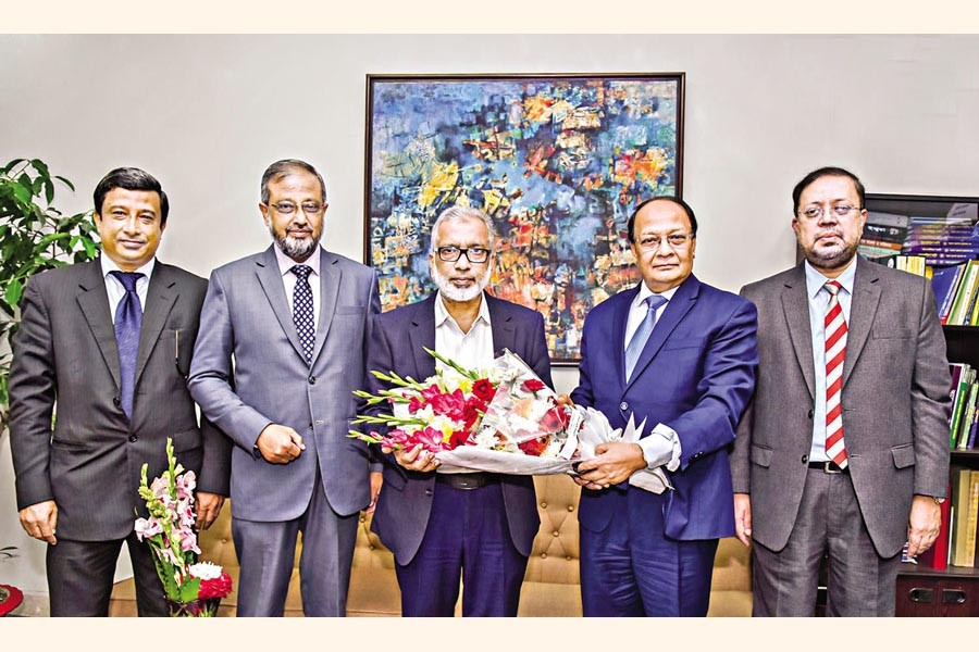 M. Kamal Hossain (2nd from right), Managing Director of Southeast Bank Limited, congratulated Md. Masud Biswas on being appointed as Head of the Bangladesh Financial Intelligence Unit (BFIU) in status of Deputy Governor, by handing over a bouquet. Anwar Uddin, Nuruddin Md. Sadeque Hussain, deputy managing directors of Southeast Bank Limited were also present on the occasion.