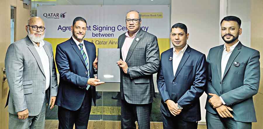 M Khorshed Anowar, DMD and head of retail and SME banking of Eastern Bank Ltd (EBL), and Mohamed El Emam, country manager - Bangladesh and Nepal, Qatar Airways, exchanged documents after signing an agreement in the capital. Under the arrangement, EBL cardholders will enjoy special discounts on Qatar Airways airfares. Md Bin Mazid Khan, head of Bancassurance, Student Banking and Retail Propositions, EBL, and Bakhshi Mohd Tayab, commercial manager - Bangladesh, Qatar Airways, were present at the event.