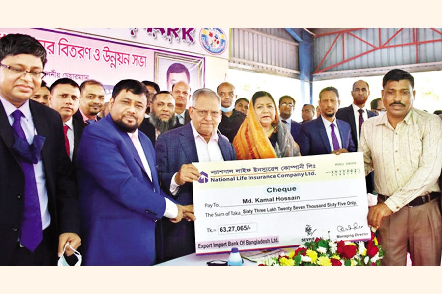 Morshed Alam, MP, chairman of National Life Insurance Co Ltd (NLI), distributing a cheque to a client as settlement of insurance claim. The company settled such claims worth Tk 500 million in a programme held in Narsingdi recently where Mohd Kazimuddin, CEO of NLI was present, among others.