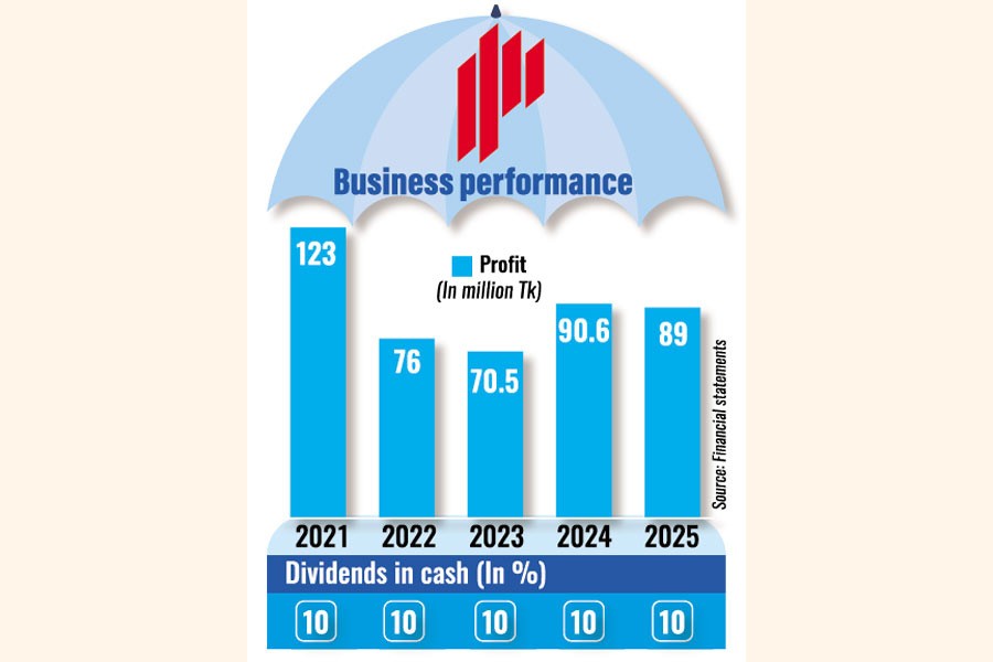 According to a disclosure filed with the Dhaka Stock Exchange (DSE) on Wednesday, the general insurer's profit fell 2 per cent year-on-year to Tk 89 million, down from Tk 90.6 million in 2024.