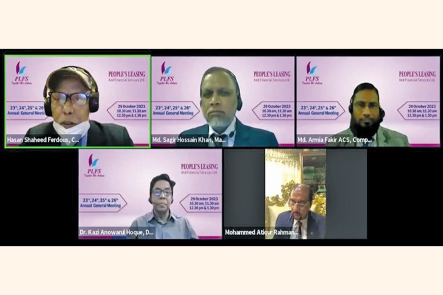 People's Leasing and Financial Services Limited held its 23rd, 24th, 25th and 26th annual general meetings (AGMs) for the financial years 2018, 2019, 2020 and 2021 on a virtual platform recently. Hasan Shaheed Ferdous, chairman of the board of directors, presided over the meetings. Md Sagir Hossain Khan, managing director, and Armia Fakir, company secretary, attended the meetings. During the AGMs, the shareholders approved the company's audited financial statements and audit reports unanimously.