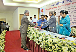 Md Nasser Shahrear Zahedee, Chairman of Radiant Pharmaceuticals Limited receiving an award being one of the highest VAT payers to the exchequer from State Minister for Finance MA Mannan, MP at the ceremony at a club in the capital Thursday.