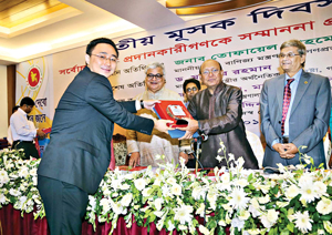 Mr. Baker Zhou, CEO of Huawei Technologies Bangladesh Ltd. receiving an award on behalf of Huawei as one of the top VAT payers of 2012-2013 from Commerce Minister Tofail Ahmed, MP, Thursday.