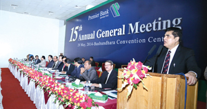 Chairman of Premier Bank Ltd Dr HBM Iqbal addressing the 15th AGM of the Bank Wednesday at Bashundhara Convention Center-2, Baridhara in the city. The Bank AGM approved 10 per cent dividend in the form of bonus share for the year ended December 31, 2013.