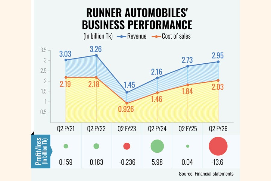 Runner Automobiles endured a loss of Tk 14 million in the second quarter through December of FY26, due mainly to lower sales in the three-wheeler segment amid temporary supply chain disruption.