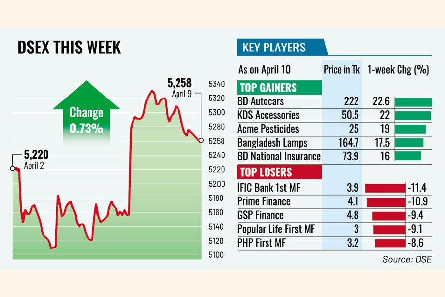 Finally, DSEX, the benchmark index of the Dhaka Stock Exchange (DSE), rose by 38 points or 0.73 per cent to close at 5,258, partially recovering from a 96-point loss in the previous week.