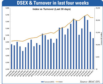 The daily turnover averaged at Tk 17.31 billion, registering a decline of 3.58 per cent over the previous week's average of Tk 17.95 billion.