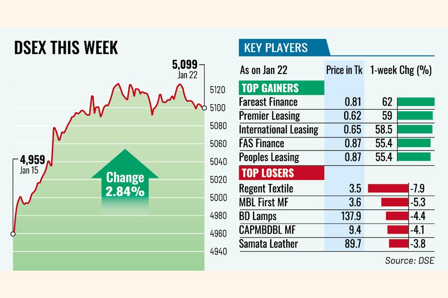 The prime DSEX index finally settled the week 140 points or 2.84 per cent higher at 5,099, after losing 39 points in the previous week.
