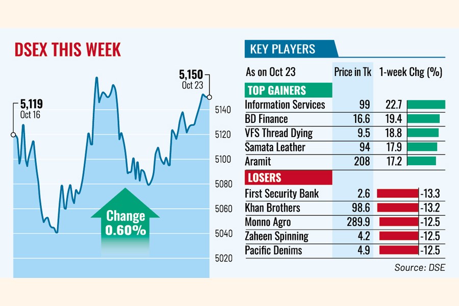 The DSEX, the prime index of Dhaka Stock Exchange, finally settled the week 30 points, or 0.60 per cent, higher to 5,150. The index had lost 296 points in the past two consecutive weeks.