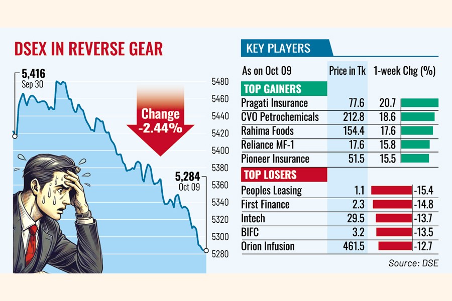This week, only the first trading session ended higher, while the remaining four closed sharply lower, with the DSEX plunging nearly 132 points, or 2.44 per cent, to 5,283 -- its lowest level since July 22 this year.