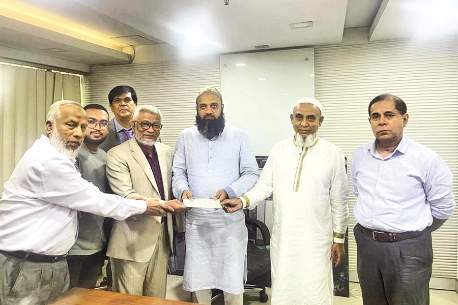 Chief Executive Officer (CC) of Takaful Islami Insurance Limited Abul Kalam Azad hands over a cheque for Tk 69,173,522 to Managing Director of Zam Zam Spinning & Textile Mills Ltd. Md Kamrul Hasan against a fire insurance claim