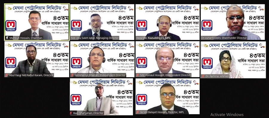 The 43rd annual general meeting of Meghna Petroleum Ltd was held on Saturday on digital platform. Md Mahbub Hossain, senior secretary of Energy and Mineral Resources Division & chairman of the company, presided over the AGM which approved 150 per cent cash dividend for its shareholders. Abu Saleh Iqbal, managing director of the company, attended, among others.