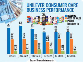 Unilever Consumer Care's profit dropped 12 per cent year-on-year to Tk 121 million in January-March this year, weighed down by sluggish sales amid persistent inflation and the reimposition of royalty charges by its parent company.