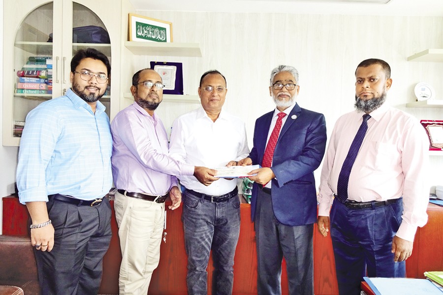 Chief Executive Officer of Union Insurance Co. Ltd. Talukder Md Zakaria Hossain hands over an insurance claim settlement cheque to Mayor of Joypurhat Municipality Md Habibur Rahman against a Motor Insurance Policy on Monday. Agrabad Branch In-charge & Chattogram Zonal Head Md Monir Uddin, Head of Claim Mohd. Azad Hossain and Company Secretary Shafquat Moula were present.