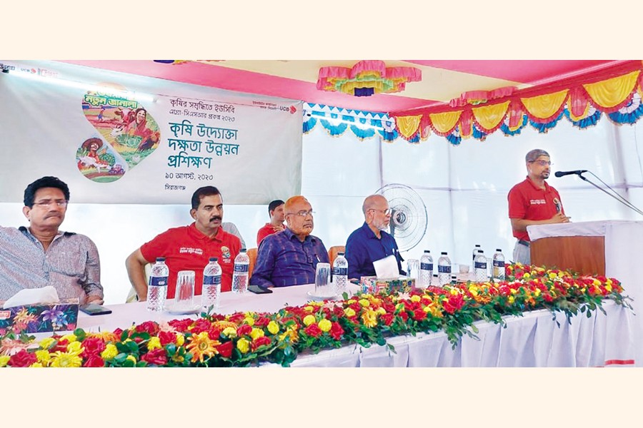 United Commercial Bank PLC organised a skill development training for local agriculture entrepreneurs under Agri-CSR project 2023 'Voroshar Notun Janala' on Sirajganj NDP premises Thursday. The day-long training programme was attended by 300 entrepreneurs from nine upazilas of Sirajganj district. Distinguished agronomist and president of BSAFE Foundation Dr. Md Zainul Abedin, Deputy Managing Director and Company Secretary of United Commercial Bank ATM Tahmiduzzaman, Deputy Managing Director Mohammad Shah Alam Bhuiyan, Rezaul Karim Siddique, anchor Maati O Manush, Bangladesh Television, NDP's executive director Md. Alauddin Khan and UCB officials attaended the opening ceremony.