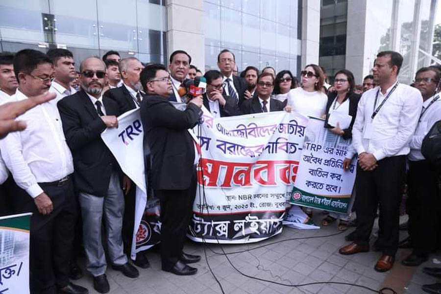 Dhaka Taxes Bar Association held a human chain event in front of National Board of Revenue (NBR) office at the city's Agargaon area on Wednesday. They demanded suspension of Tax Return Preparer (TRP) rule, and allocation and handover of space for income tax lawyers on NBR premises at Agargaon.