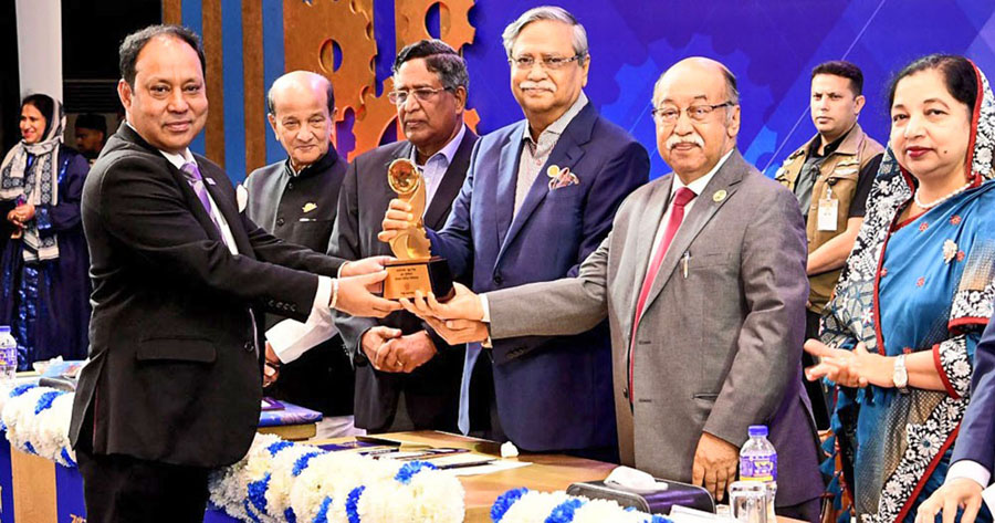 Managing Director of Technomedia Limited Dr Joshoda Jibon Debnath receiving the Bangabandhu Sheikh Mujib Industrial Award