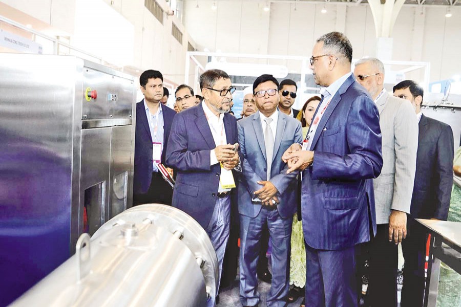 Minister for Health and Family Welfare Sardar Md Shakhawat Hossain visiting a stall after inaugurating the "Asia Pharma Expo-2026" at the Bangladesh Friendship Exhibition Centre at Purbachal in the city on Sunday. — PID Photo