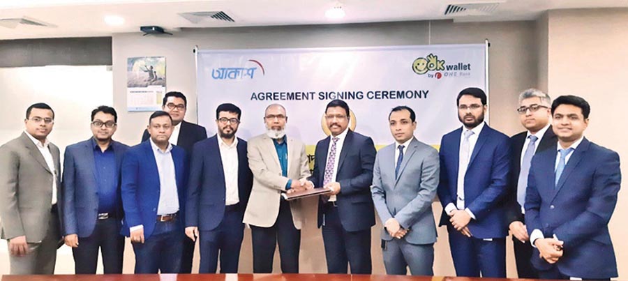 ONE Bank Limited Additional Managing Director Md Monzur Mofiz (5th from right) and Beximco Communications Limited Chief Financial Officer Md Luthfor Rahman exchanging documents after signing an agreement on behalf of their respective organisations in the city recently. Under the deal, OK Wallet customers could pay Akash DTS device fee and monthly subscription bill