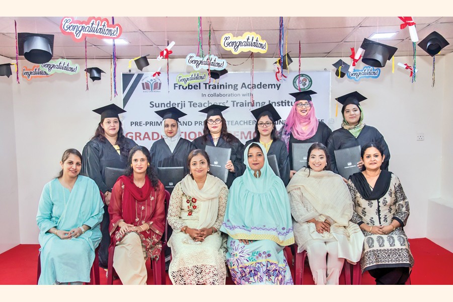Huwra Zohair (3rd from left-sitting) and Sabeen Aameir (2nd from left-sitting), directors of Frobel Academy and also board members of BSRM Group of Companies, seen along with alumni from the first batch of Pre-Primary and Primary Teachers' Training Course (PPTC) graduated from Frobel Training Academy. In collaboration with Sunderji Teachers' Training Institute, Pune, India, the one-year course was launched in 2017.
