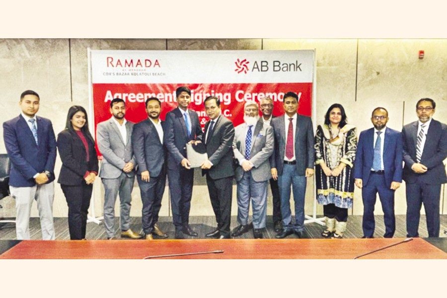 AB Bank PLC has inked a Memorandum of Understanding (MoU) with Ramada by Wyndham Cox's Bazar. Under the MoU, AB Bank cardholders will enjoy 50 per cent discount on room rents during the tourist season, 60 per cent discount in off-season, 50 per cent on the banquet hall and 10 per cent on the A-La-Cart Menu and 25 per cent on SPA. In the presence of Iftekhar Enam Awal, Deputy Managing Director, AB Bank PLC, Md. Habibul Mamun, Head of Cards, AB Bank PLC, and Khaled Bin Ahmed, Chief Operating Officer, Ramada by Wyndham Cox's Bazar, signed the agreement on behalf of their respective organisations. Taufiq Hassan, Head of Retail Banking, AB Bank PLC, and Yeasir Mostafa, Manager, Sales & Marketing, Ramada by Wyndham Cox's Bazar were also present.
