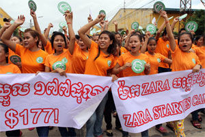 About 500 workers joined a brief rally at a garment factory in an industrial park in Phnom Penh to urge international buyers, including GAP, Levi's, H&M, Puma and ZARA to lift their basic wage to $177 a month.