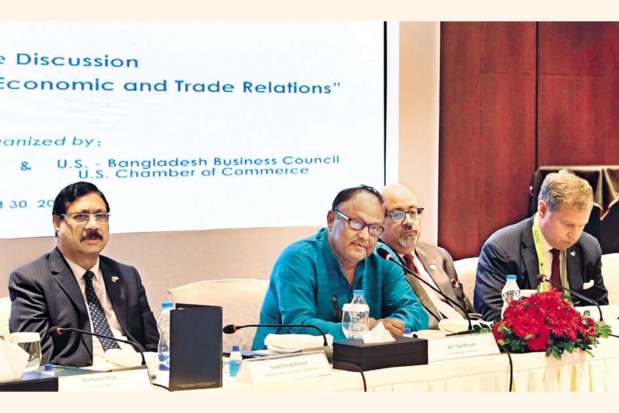 Commerce Minister Tipu Munshi speaks as the chief guest at a roundtable on 'Strengthening US-Bangladesh economic and trade relations' at a city hotel on Wednesday. US-Bangladesh Business Council organised the event. — PID